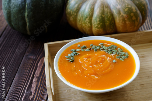 soup, table, wooden, pumpkin, autumn, rustic, parsley, meal, bowl, cream, board, vegetarian, vegetable, squash, creamy, orange, herb, fresh, food, lunch
