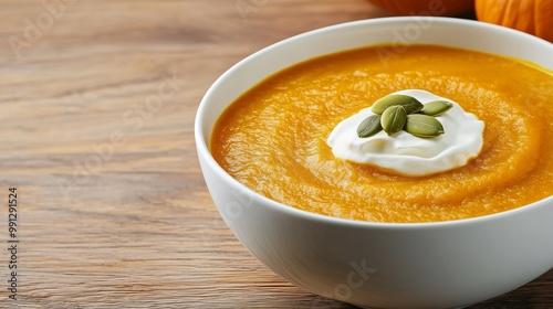 Creamy pumpkin soup topped with yogurt and pumpkin seeds, served in a white bowl on a rustic wooden table.