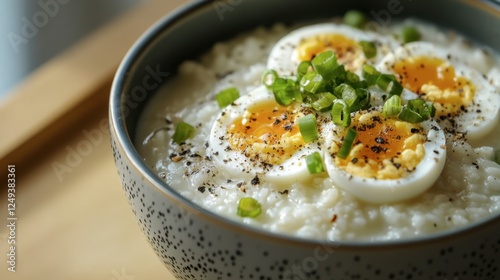 Creamy Rice Bowl with Soft Boiled Eggs and Green Onion Garnish