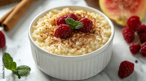 Creamy rice pudding with raspberries and cinnamon in a white bowl