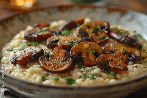 risotto, creamy, mushroom, sauteed, herb, dish, food, meal, dinner, lunch, epicure, italian, cookery, white, brown, green, plate, bowl, delicious, savoury, aromatic, tasty, flavorful, fresh, parsley, pepper, salt, garlic, olive, oil, rich, texture, appetising, elegant, rustic, healthy, vegetarian, vegan