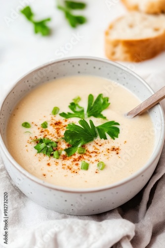 soup, creamy, parsley, green onion, paprika, bread, kitchen, cosy, meal, garnish, healthy, homemade, comfort food, receipe, dining, bowl, dish, warm, rustic, culinary, vegetarian, cooking, nourishment, lunchtime, eating, delicious, wholesome, presentation, vibrant, tasty, spice, texture, kitchen table, appetising, inviting, comfort, nourishing, enjoyment, leisure, culinary arts