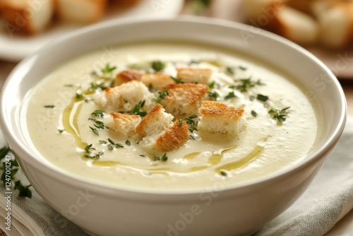 soup, creamy, crouton, herb, olive, bowl, warm, comforting, food, dish, meal, epicure, delicious, homemade, healthy, rustic, fresh, cookery, nourishment, eatery, closeup, smooth, elegant, lunch, dinner, fine dining, wholesome, vegetarian, cosy, light, parsley, garlic, onion, traditional, organic, broth, tasty, culinary, white, presentation, soft, indulgent, spoon