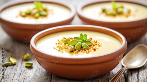 Creamy soup with pistachio garnish rustic bowl wooden background food photography healthy eating kitchen cuisine