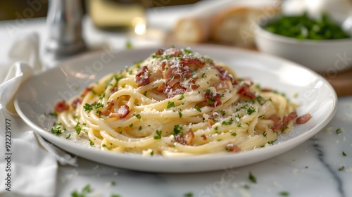 Creamy spaghetti carbonara with crispy bacon and Parmesan