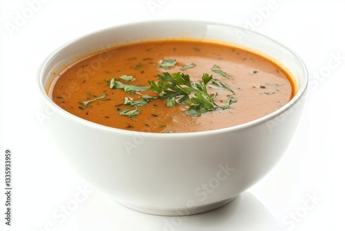 Creamy tomato soup garnished with fresh parsley in white bowl against clean white background studio shot