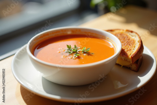 Creamy tomato soup with grilled cheese sandwich in natural light