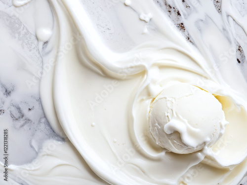 Creamy vanilla ice cream melting on a marble surface in a bright kitchen setting during summer