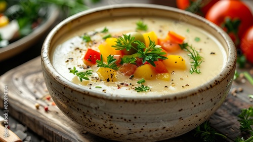 soup, vegetable, creamy, parsley, tomatoes, bell pepper, black pepper, garnish, bowl, white, yellow, red, green, food, dish, dinner, lunch, healthy, tasty, delicious, fresh, homemade, cooking, receipe, kitchen, meal, eating, favor, spice, aroma, fragrant, warm, comforting, hearty, simple, easy, quick, alimentary