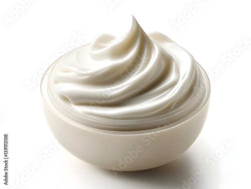 Creamy white mayonnaise swirls in a small bowl isolated on a pure white background perfect for food packaging design.
