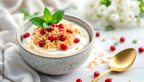 yogurt, cranberry, coconut, mint, breakfast, healthy, bowl, food, fresh, delicious, epicure, white, spoon, wooden, table, berry, toasted, cream, dairy, sweet, natural, closeup, morning, meal, gold, texture, dessert, appetising, homemade, rustic, floral, soft, light, isolated, simple, bright, clean, nourishing, diet, lifestyle, wellness, snack, smooth, vegetarian, vegan, organic, flavorful, garnished