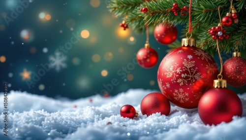 create a christmas themed illustration with a festive background featuring balls, such as ornaments or baubles, on the left side of the image, place a clearly identifiable subject