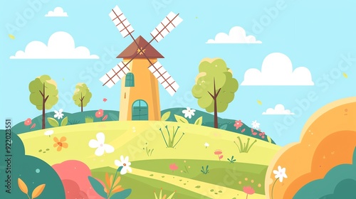 Create a illustration of a Windmill in the distancein a kawaii style, simplified to feature fewer elements for a cleaner look, Use a color palette that is appealing to children, with bright and