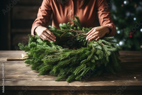 chaplet, christmas, making, bricolage, green, natural, winter, table, countryside, branch, lifestyle, background, woman, people, tree, home, merry christmas, hand, holiday, person, christmas, candle, wooden, season, decoration, pine, fir, spruce, seasonal, scissors, florist, workshop, gold, scandinavian, rustic, greeting, authentic, december, handcraft, holding, preparation, stylish