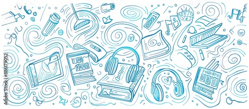 Creative and educational poster design with abstract line art of books and headphones.