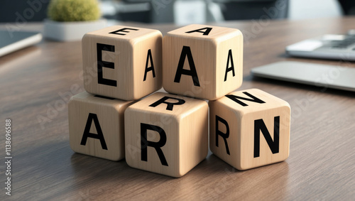 Creative arrangement of wooden blocks forming words that inspire innovation and learning in a modern workspace setting