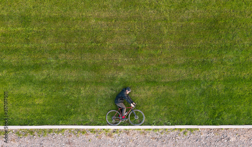 Creative autumn composition of a cyclist lying on a green lawn with a bicycle. Minimalistic concept. Drone top view.