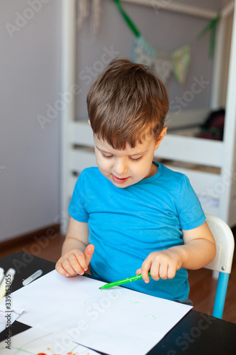 Creative boy, paints in his room. Educational games for preschool children