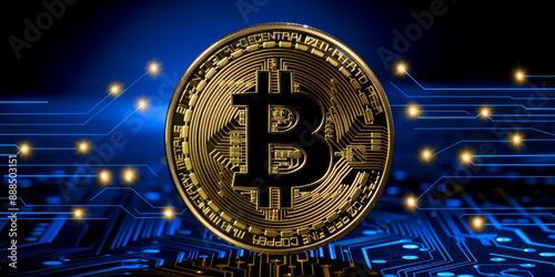 Creative glowing crypto coins on dark blue backdrop with circuit lines. Cryptocurrency, digital money, technology and economic network concept. 3D Rendering.