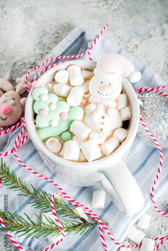 Creative idea for christmas drink, delicious hot chocolate with funny marshmallow snowman, christmas tree, rain dear, santa, on home background with xmas decoration copy space top view
