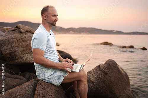 beach, sunset, laptop, man, rock, ocean, writing, nature, calmness, relaxation, professional, evening, sky, wave, sharpened, solitude, work, creativity, serene, warm colors, coastline, horizon, lifestyle, summer, inspiration, scenic, shore, computing, leisure, calm, palm tree, adventure, aesthetic, peaceful, environment