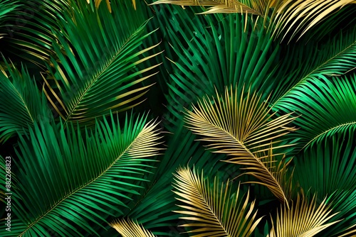 Creative nature background. Gold and green tropical palm leaves. Minimal summer abstract jungle or forest pattern.