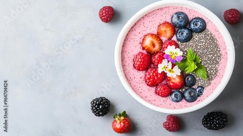 Creative overhead shot of a smoothie bowl with fresh berries, chia seeds, and edible flowers