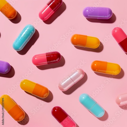 Creative pattern made of pills on pastel pink background. Flat lay, top view