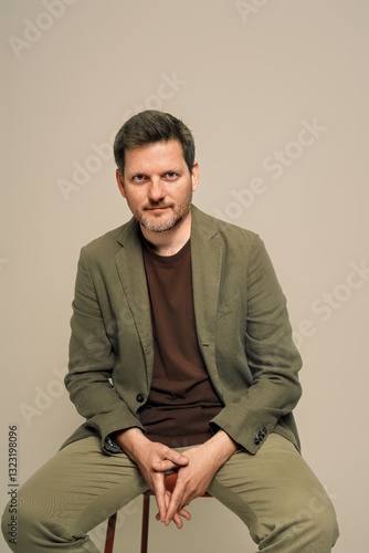 beige, blazer, brown, casual attire, confident, cool, creative, expression, fashion, fashionable, formal, head shot, isolated, khaki, minimalist, modern, neutral, pant, portrait, pose, professional, relaxed, shirt, shoe, simple, studio, stylish