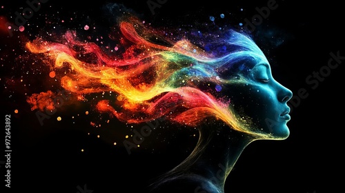 Creative thinking. Idea generation. Human head filled with colorful swirling ideas, symbols of business and technology.
