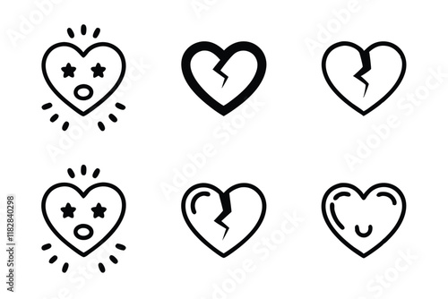 Creative vector icon set of broken hearts and emotional symbols with frowns, cracks, and colorful sparkles in modern minimalist style