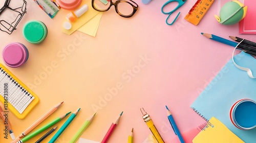 school, supply, education, stationery, colours, desk, creative, workplace, learning, colourful, design, object, paper, office, table, equipment, top, view, arrangement, pastel, composition, background, surface, element, item, set, tool, mock, up, bright, pink, orange, notebook, crayons, ruler, goggles, scissors, note, pad, wax crayons, eraser