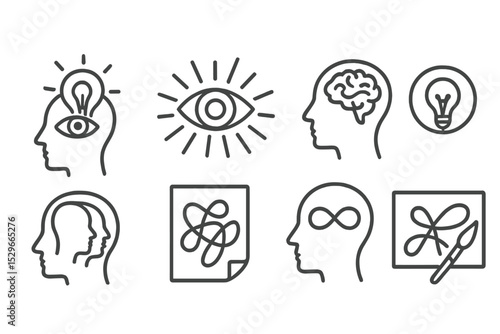 Creativity Icons Collection. Line style icons of creativity: inspired vision, visual burst icon, limitless brain, creative core,