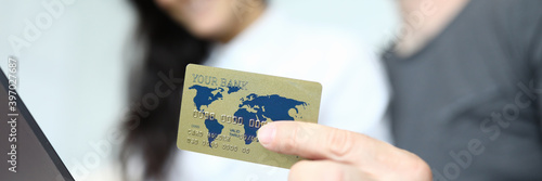 Credit bank card on the background of man and woman. How to lure a man into a joint shopping concept