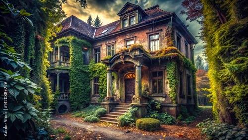 Creepy Abandoned Manor House Entrance: Overgrown Gateway to a Lost Place