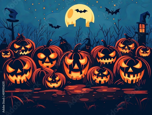 Creepy pumpkin patch, sinister faces, Halloween night, flat design illustration