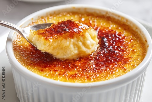 Creme brulee. dessert with caramel crust. Elegant Gourmet Dessert with Caramelized Sugar Crust. French vanilla cream. Eating Creme Brulee with Spoon. Cracking caramel. Delicious Sweet. Catalan cream.
