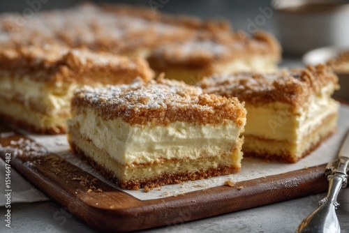 Cremeschnitte Vanilleschnitte Schichtkuchen mit Creme Blätterteigschnitte Vanillecremeschnitte Dessertkuchen Sahneschnitte Kuchen mit Puderzucker Cremeschnitten Rezept Feiner Cremekuchen Backidee