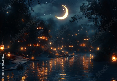 crescent moon, night, serene, lantern, glowing, peaceful, dark, illuminated, mystical, tranquil, enchanting, soft light, ramadan, spiritual, scenic, atmospheric, celestial, dreamy, beautiful, sacred, golden light, nature, breathtaking, twilight, elegant, magical, moonlight, divine, harmony, timeless, soothing, aethereal, mesmerizing