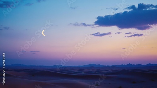 Crescent Moon Over Purple Desert Dunes at Twilight