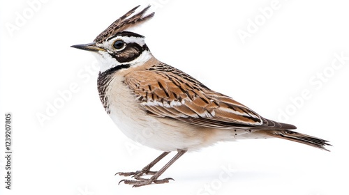 lark, bird, crested, profile, wildlife, avian, animal, nature, fauna, feather, songbird, creature, photo, zoology, ornithology, white, background, isolated, small, beauty, wild, freedom, flight, wing, beak, eye, head, tail, foot, plumage, colours, brown, beige, stripes, pattern, image, picture, stock, photo