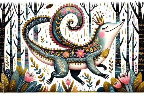 illustration, forest, nature, magic, fantasy, animal, dino, unicorn, panda, fox, elephant, stag, coloration, flora, wildlife, detail, decoration, fairy tale, mythology, plant, foliage, cartoon, vegetation, creativity, flower, leaf, poultry, landscape, watercolor, textured