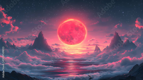 moon, red, sunrise, sunset, mountain, cloud, sky, night, pink, fantasy, landscape, nature, digital, art, illustration, twilight, astronomy, eclipse, cosmic, space, imagination, beautiful, amazing, stunning, vibrant, colours, peaceful, dreamy, epic, legend, myth, story, adventure, mountain chain, cloudscape, lake, star, dark, dramatic