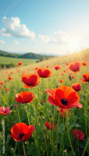 Crimson poppies sway in gentle breeze, vibrant field, image, field, botanical