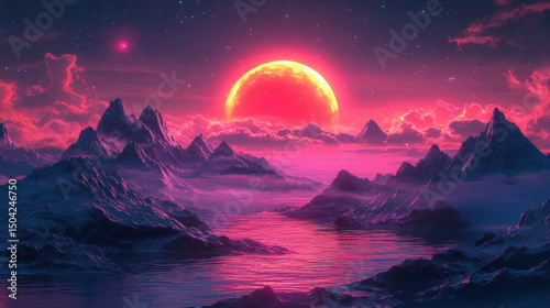 sunset, mountain, water, red, pink, purple, crimson, digital, art, fantasy, surreal, landscape, night, sky, star, cloud, snow, calm, serene, mystical, atmospheric, dreamlike, artistic, scenic, beautiful, vibrant, glowing, moon, planet, astronomic, space