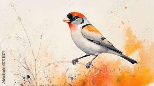 bird, watercolor, painting, avian, wildlife, art, nature, crimson, fauna, feather, wing, beak, tail, tree branch, plant, artwork, illustration, drawing, vignetting, colours, orange, grey, white, red, brown, artistic, creative, beautiful, elegant, masterpiece, detailed, realistic, high-coloured, splash, background, subtile, palette, texture, finch