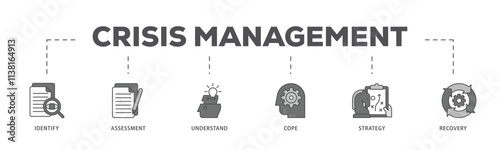 Crisis management infographic icon flow process which consists of recovery, strategy, understand, assessment, identify, cope icon live stroke and easy to edit .