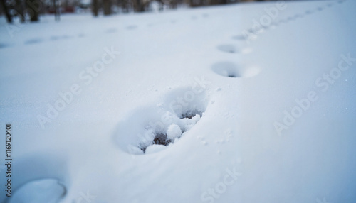 Crisp cat paw prints on untouched snow in urban park, winter tranquility