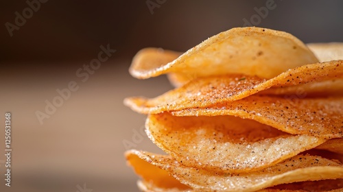 Crisp, golden potato chips stacked neatly, showcasing their wavy edges and seasoned texture, perfect for snacking or sharing.