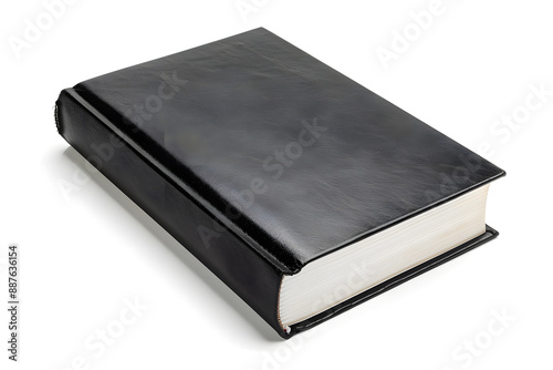 Crisp photograph of single black book isolated on white background, ultra-detailed and clean